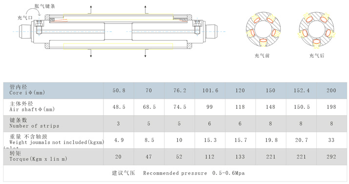1、通長鍵條式氣脹軸,收放卷都可適用,多氣囊式設(shè)計,氣囊長度與氣脹軸主體相似。