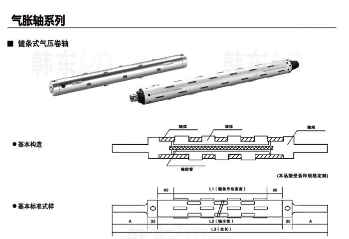 勤捷機(jī)械的氣脹軸軸主體采用優(yōu)質(zhì)鋼管,表面鍍鉻,鋁制凸鍵伸縮靈活;配置優(yōu)質(zhì)橡膠內(nèi)膽與快速充排氣氣嘴,密封效果好,使用壽命長,可拆卸軸頭,維修方便。充氣后,膨脹部分是鍵條,通常單邊膨脹高度可達(dá)5-6毫米,3英寸鍵式氣脹軸,通常使用卷管內(nèi)徑為76毫米。